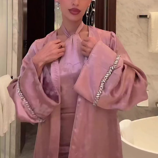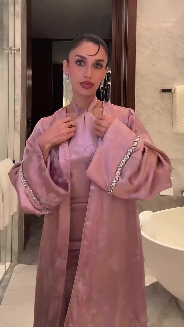 The Amarè set is thoughtfully composed of two harmonious pieces a flowing open abaya and a softly draped halter-neck dress in matching mauve jacquard.