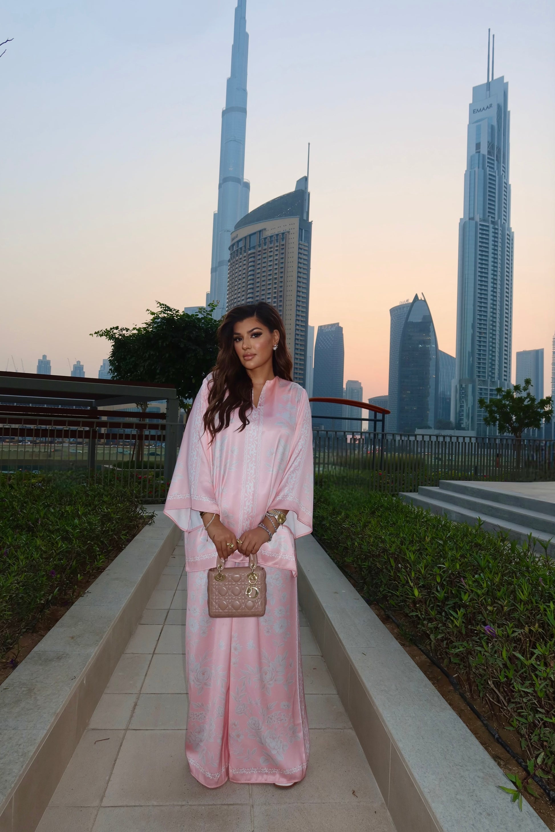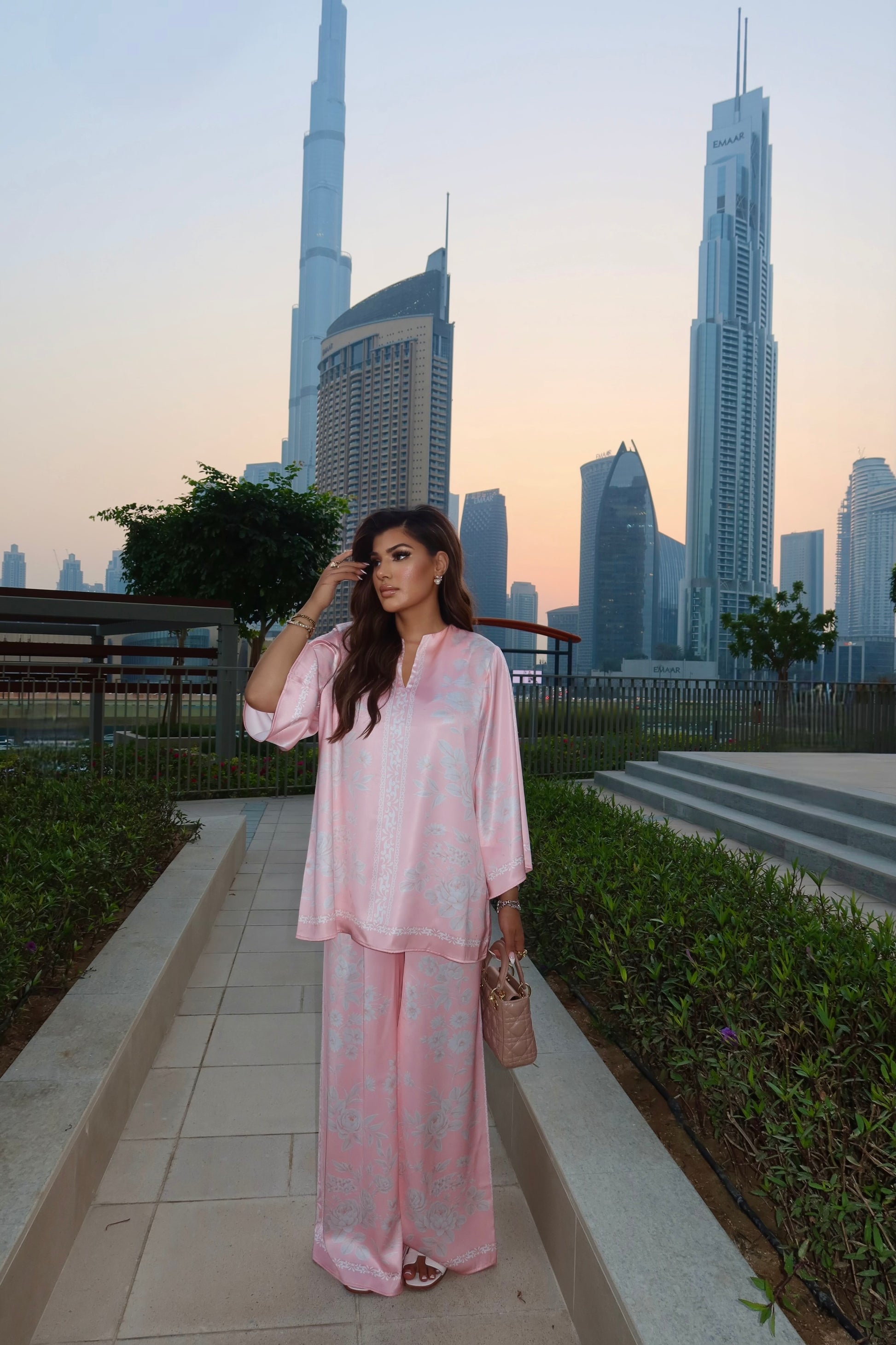- The satin fabric’s soft sheen highlights the floral print without appearing overly glossy, preserving the collection’s quiet luxury aesthetic.