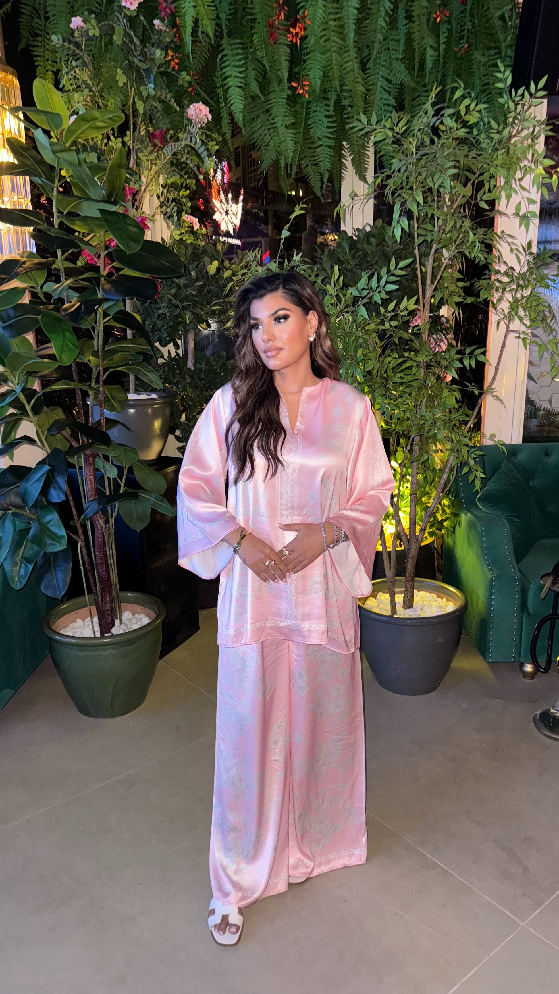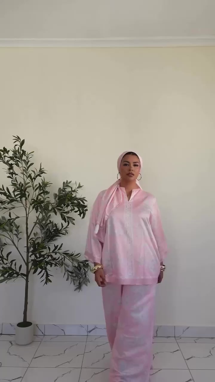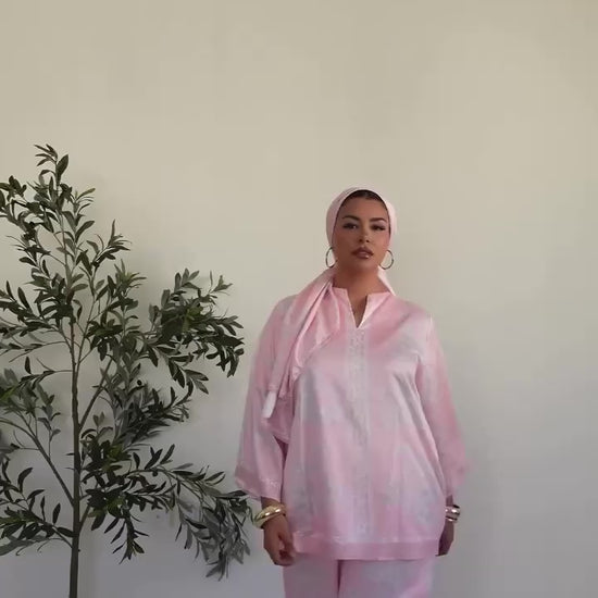 Flowing with ease and quiet elegance, the Aveline Trousers are crafted from soft pink satin printed with Opaléya’s exclusive floral design.