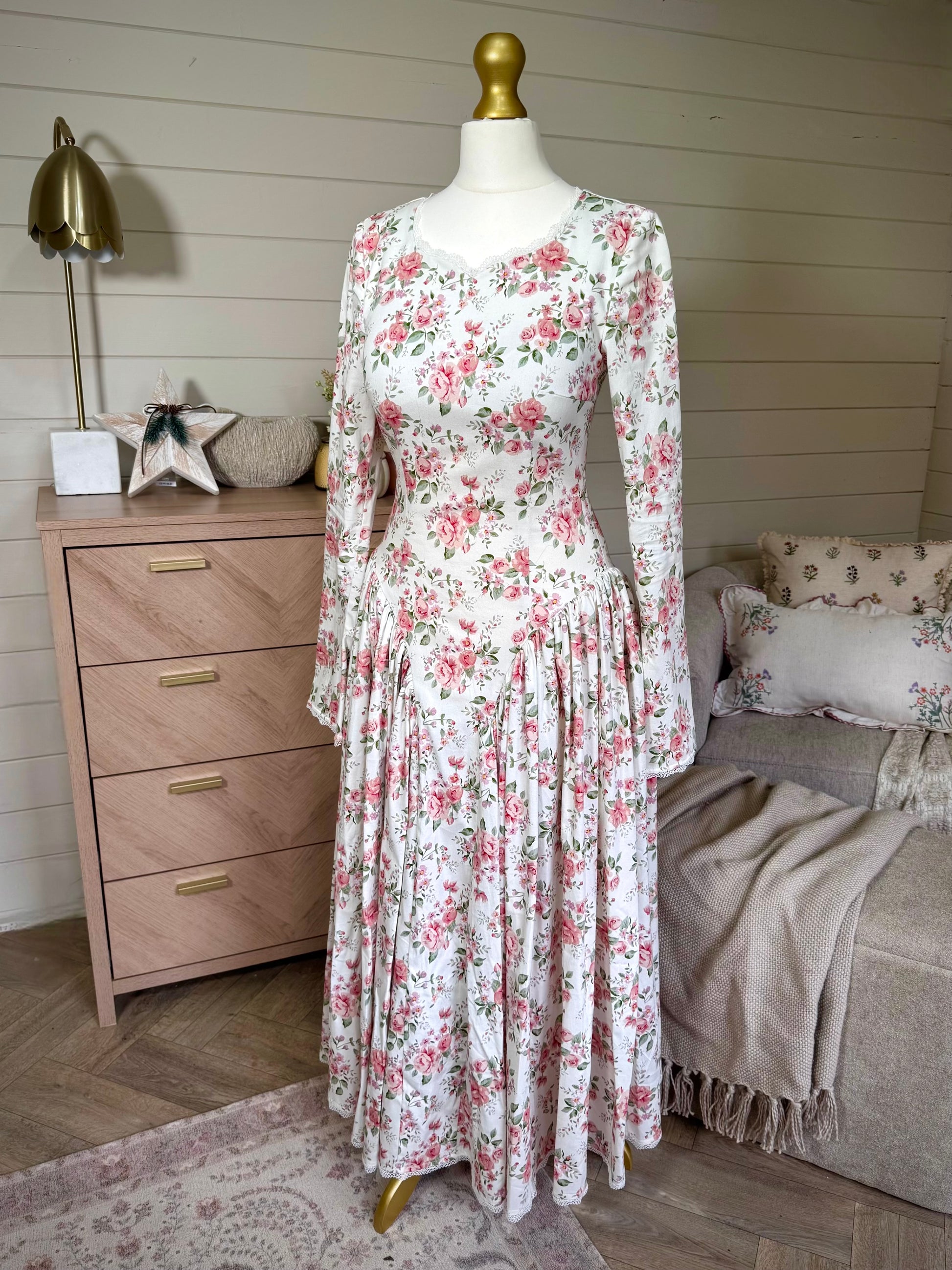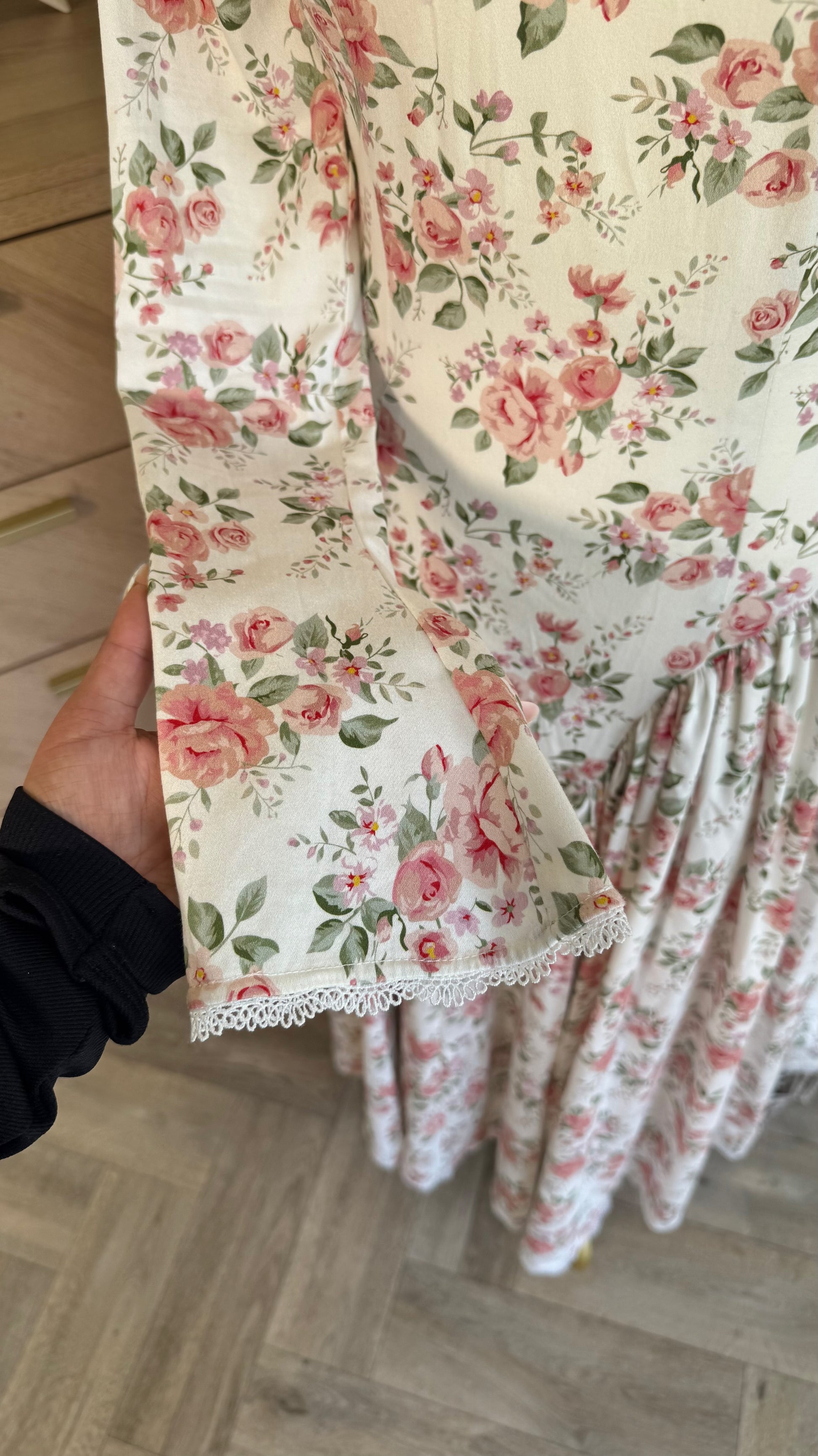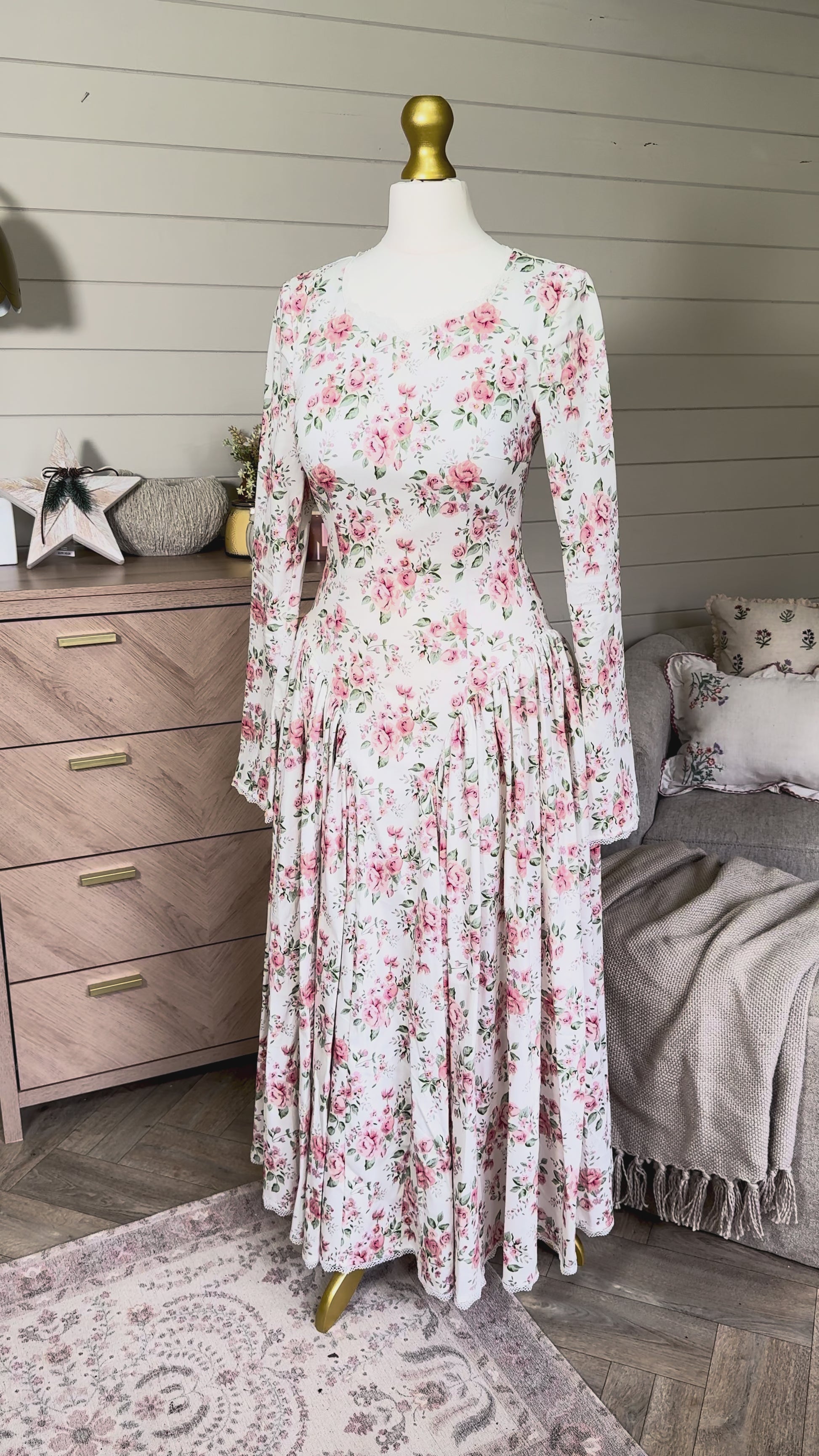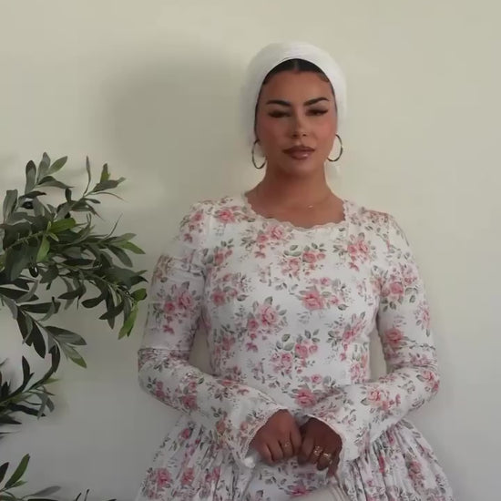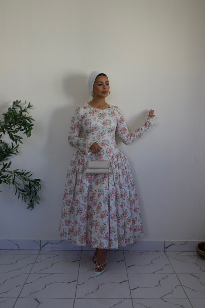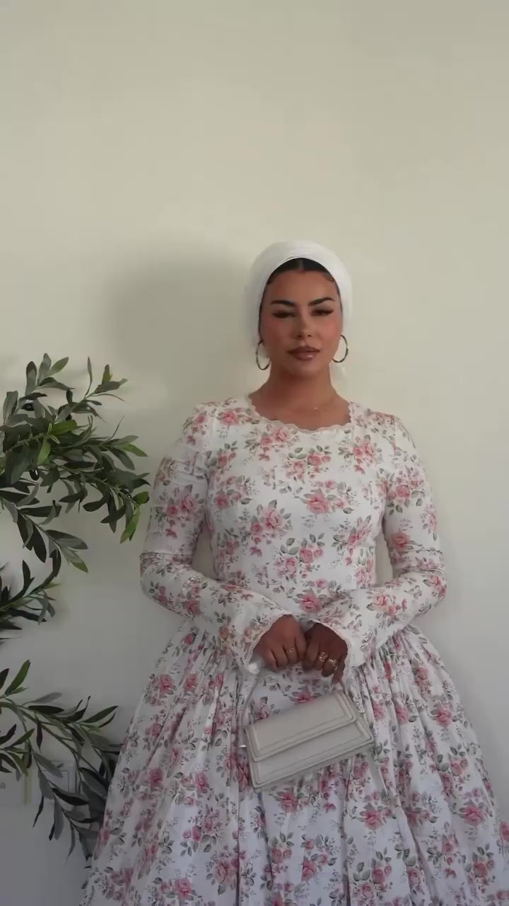 The delicate floral print evokes timeless romance, while the modest neckline, gathered waist, and flowing skirt create an effortlessly refined silhouette. Light, breathable, and gently structured, it embodies quiet elegance a piece that feels as graceful as it looks.