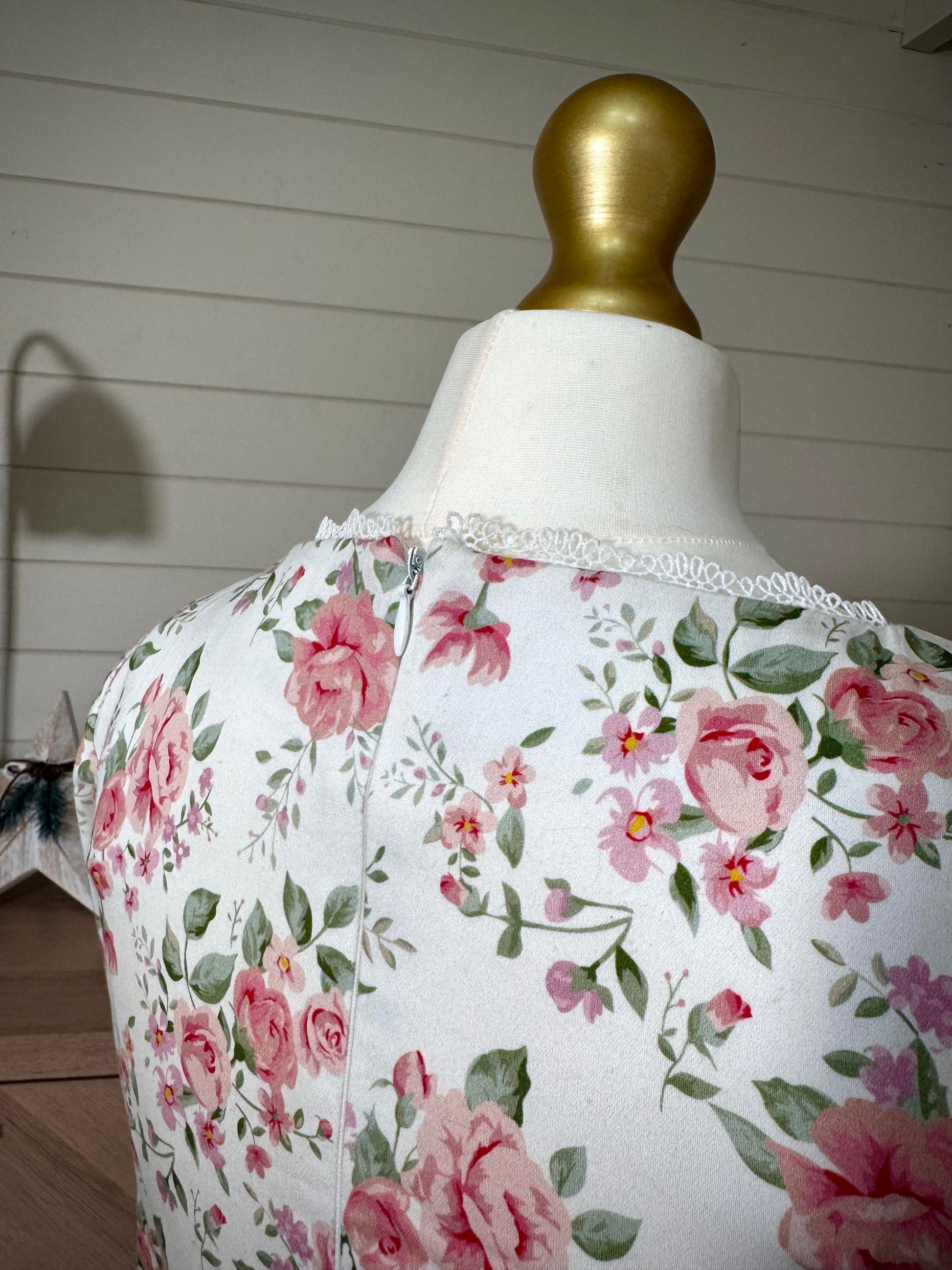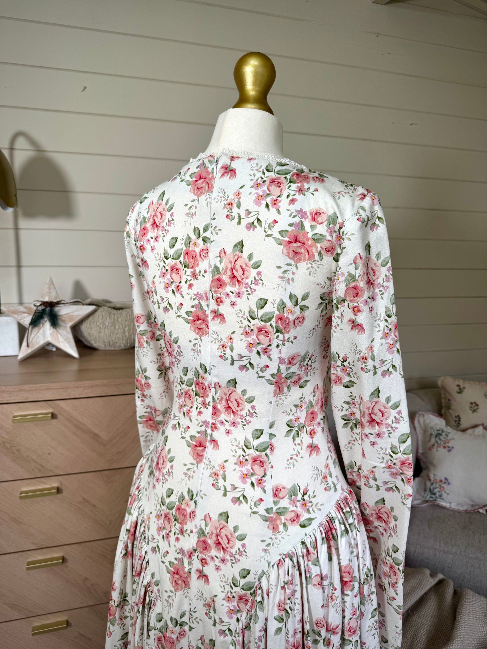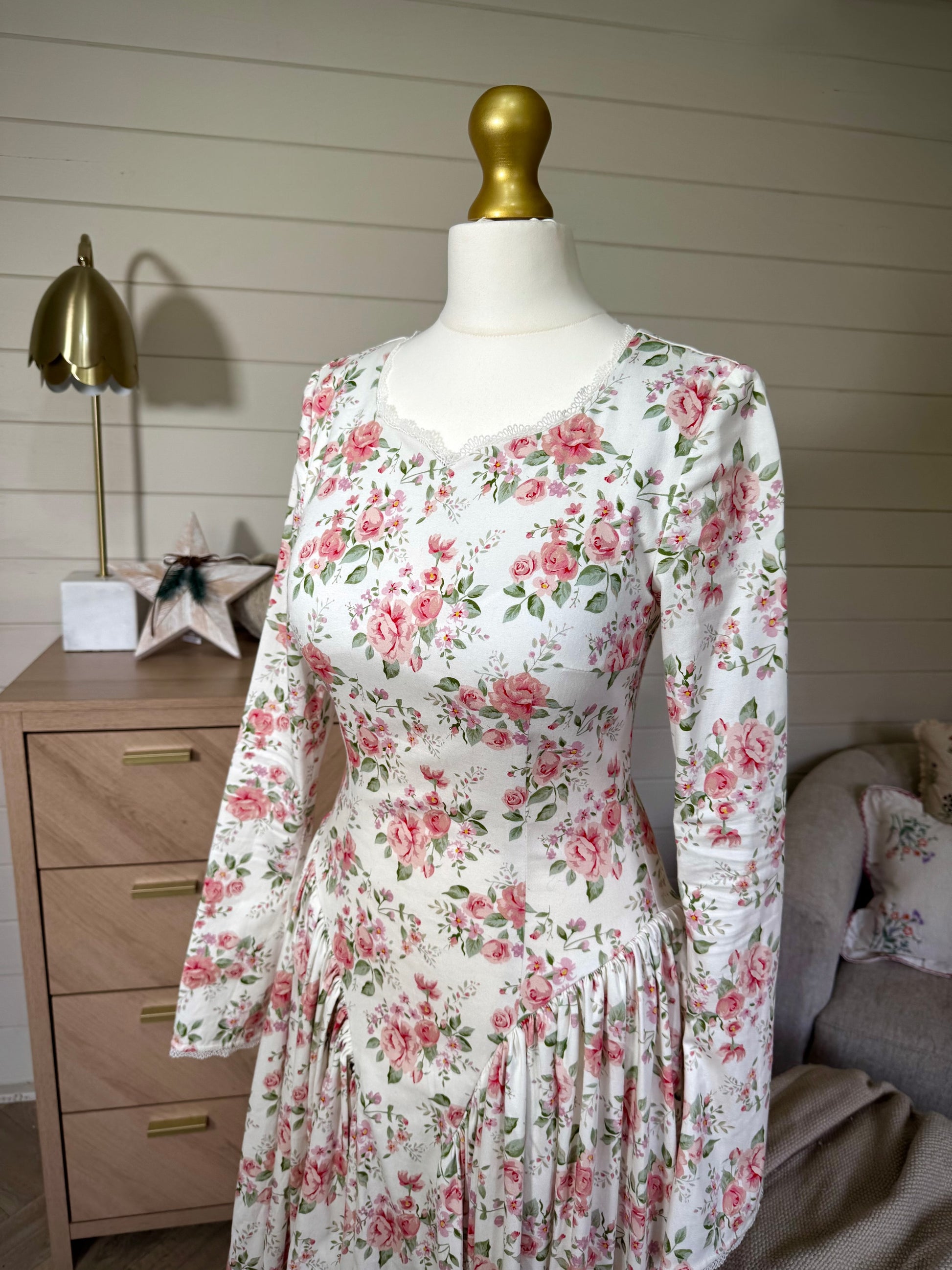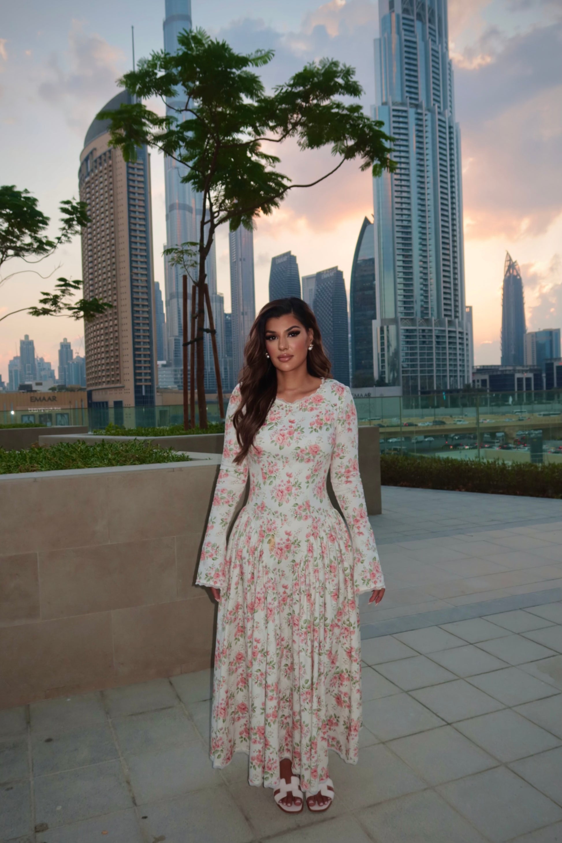 The delicate floral print evokes timeless romance, while the modest neckline, gathered waist, and flowing skirt create an effortlessly refined silhouette. Light, breathable, and gently structured, it embodies quiet elegance a piece that feels as graceful as it looks.