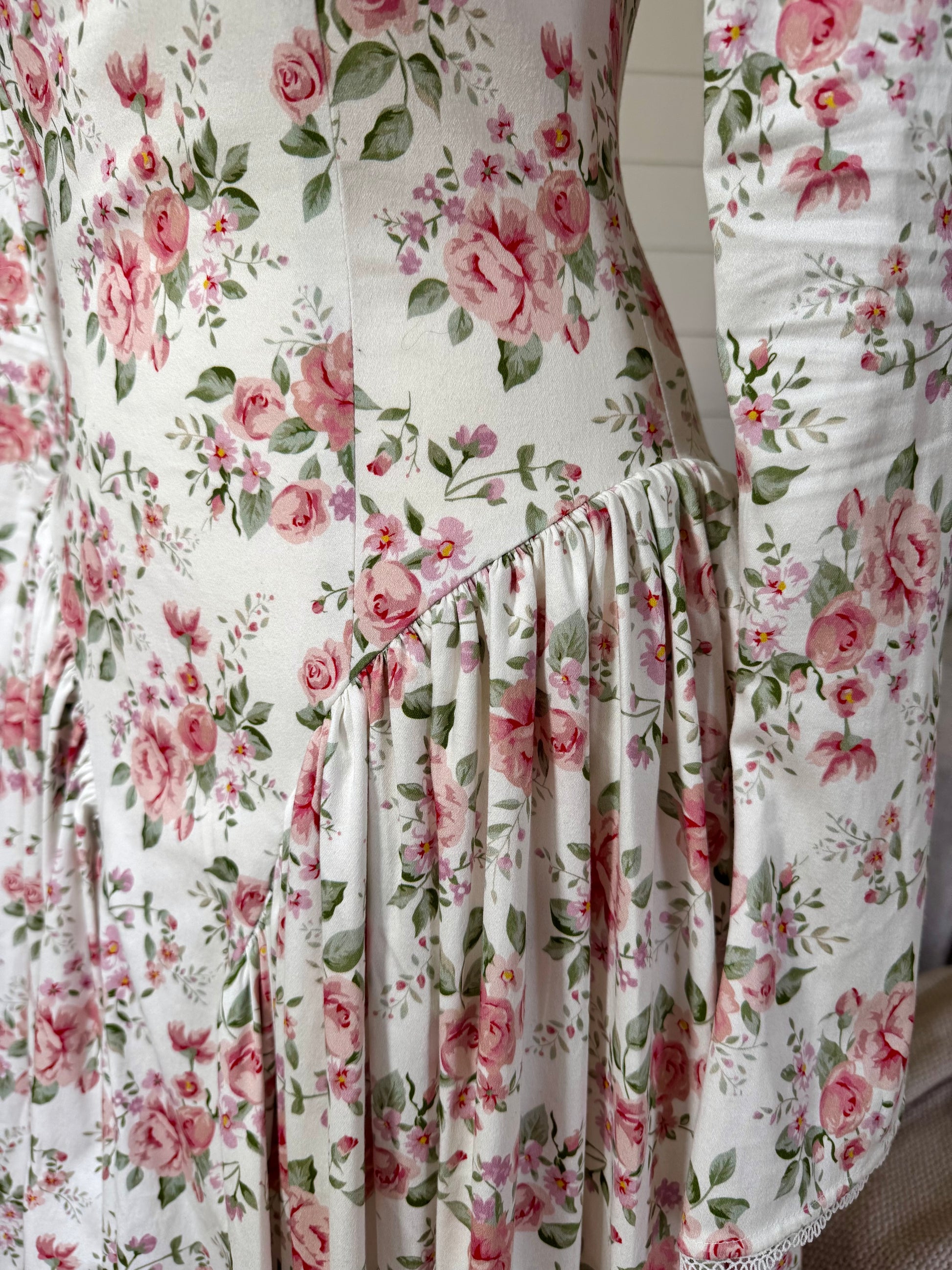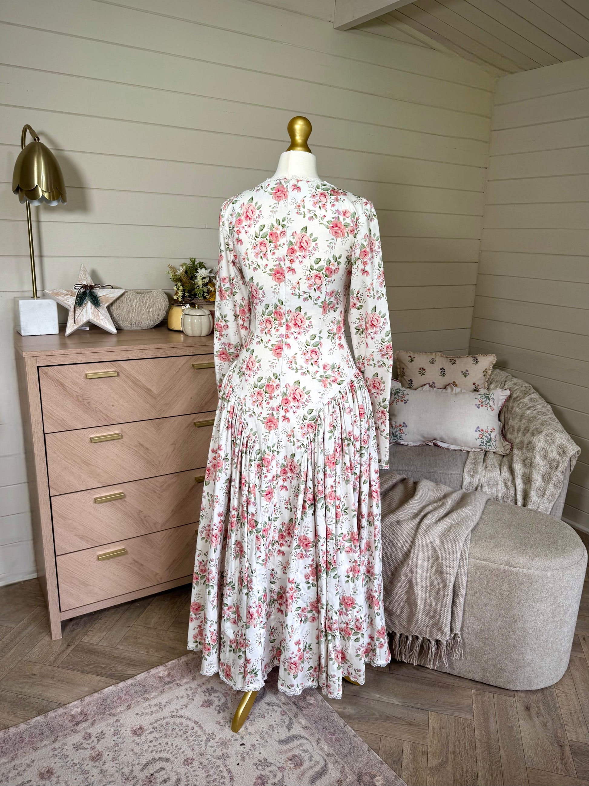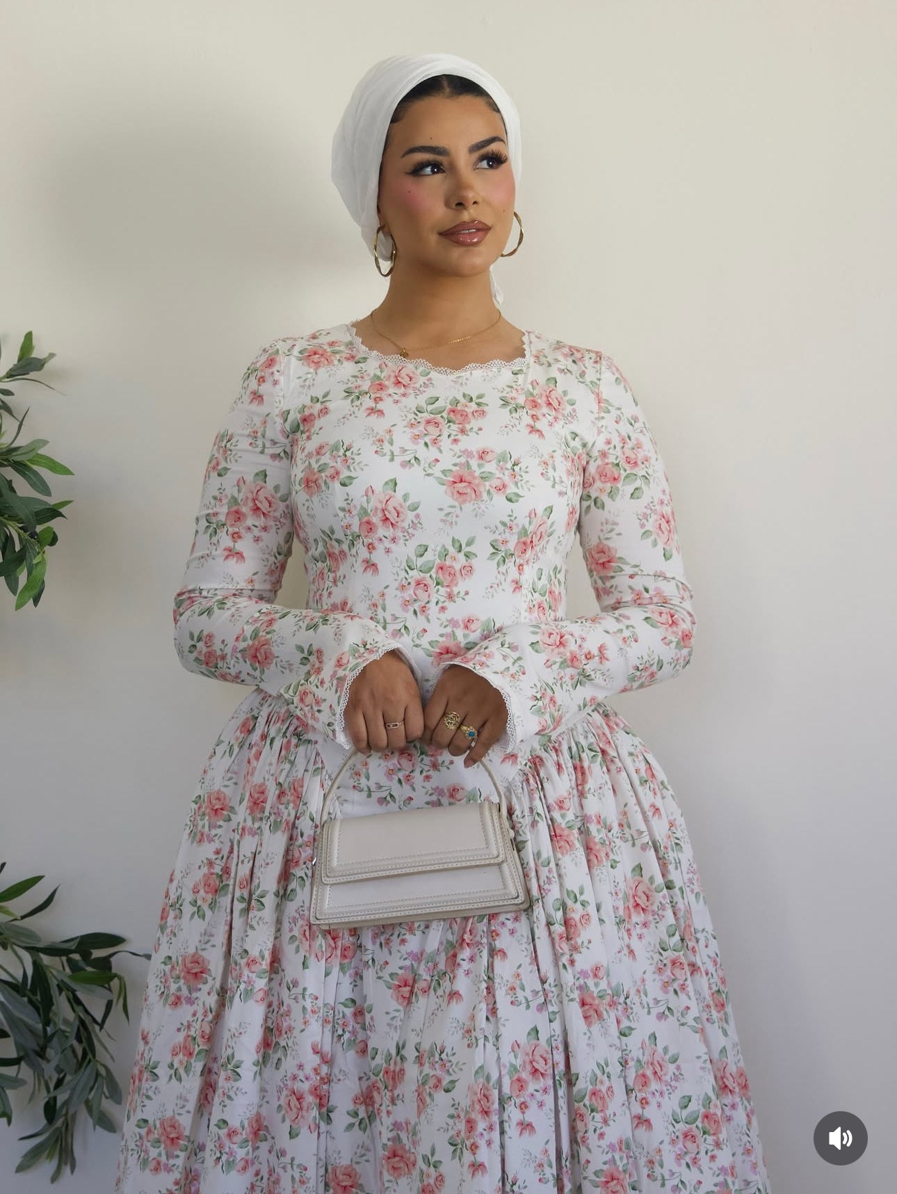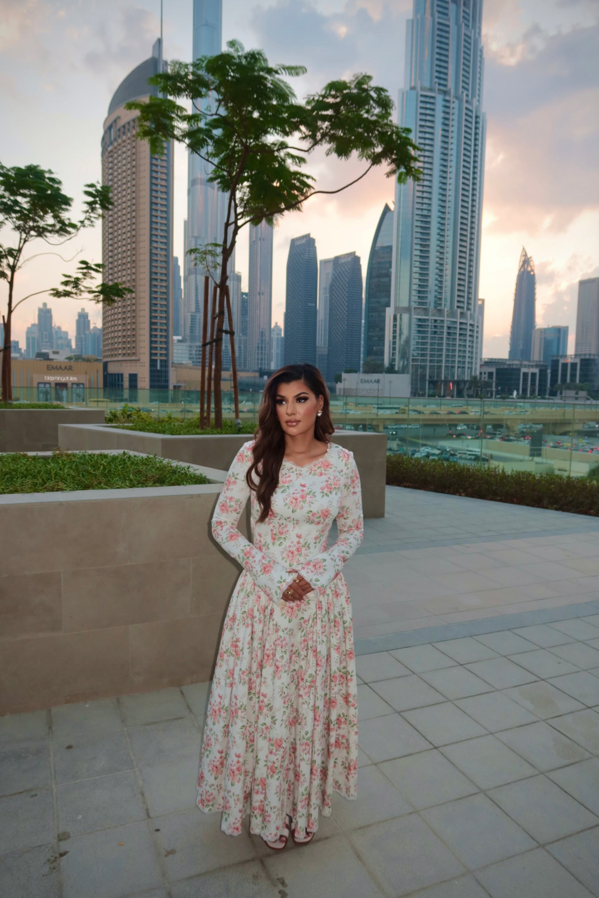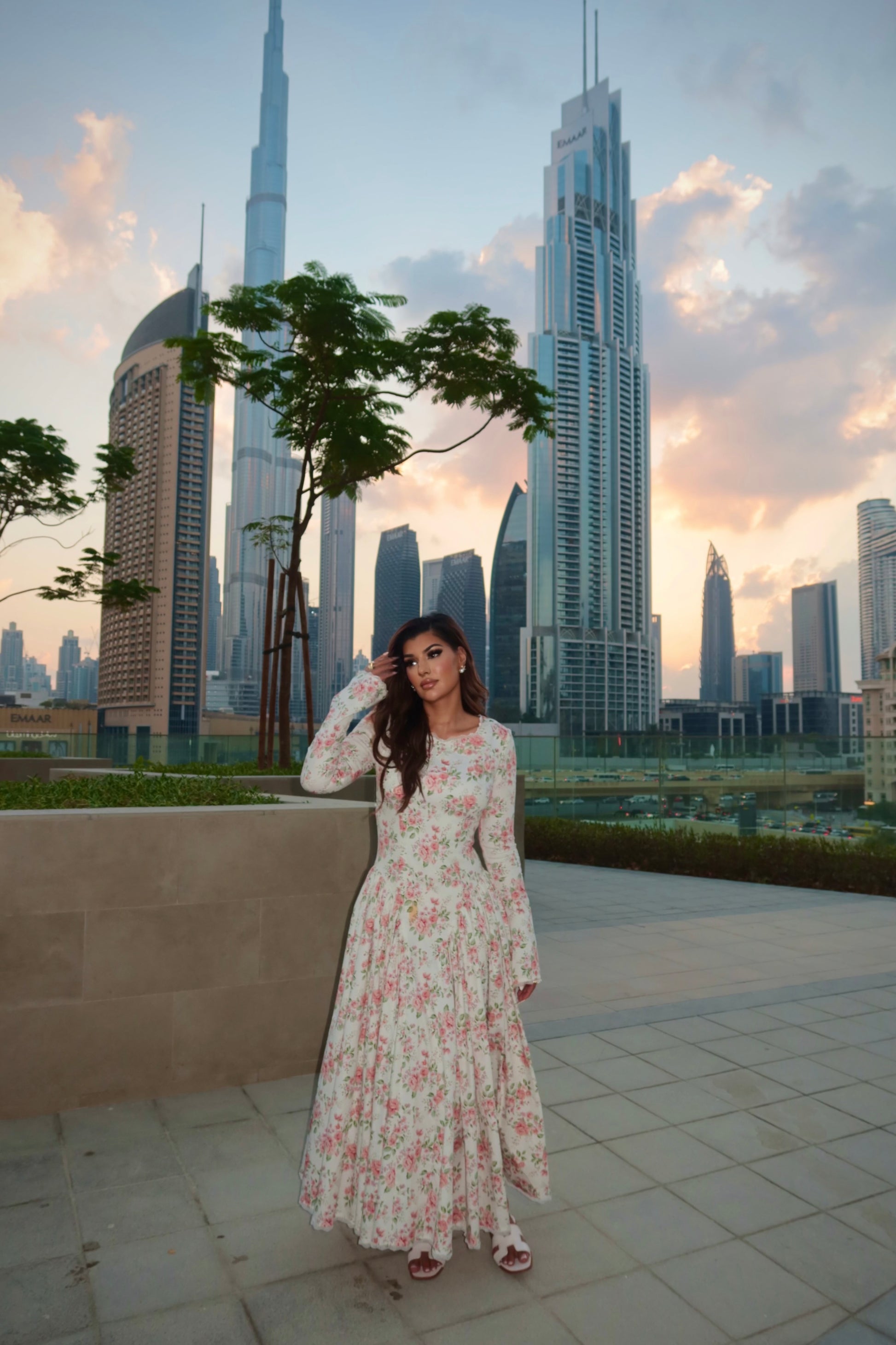The delicate floral print evokes timeless romance, while the modest neckline, gathered waist, and flowing skirt create an effortlessly refined silhouette. Light, breathable, and gently structured, it embodies quiet elegance a piece that feels as graceful as it looks.