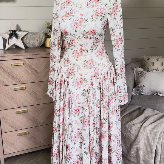 - Features a modest neckline, gathered waist, and flowing A-line skirt