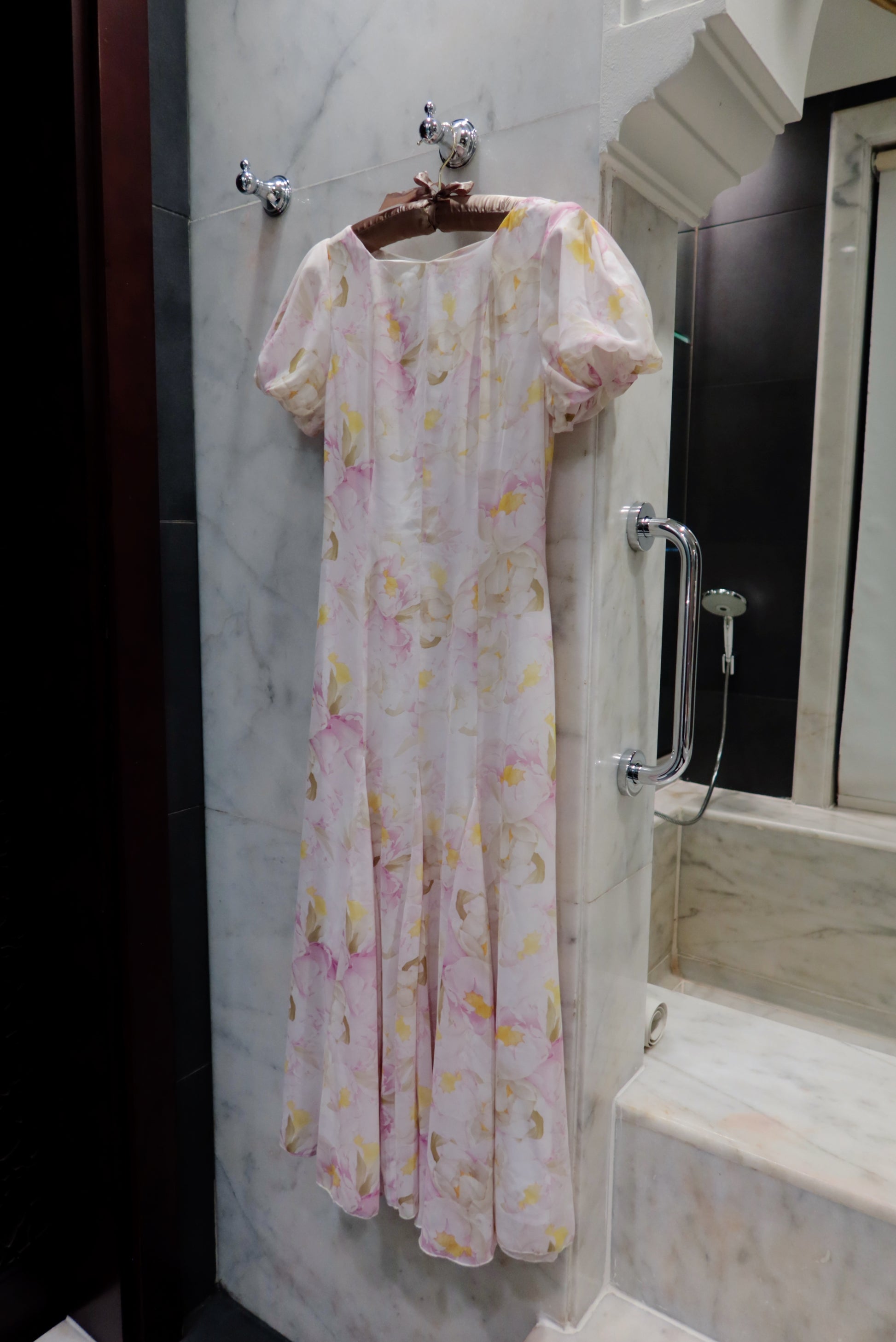 Fioraè is a softly structured ankle-length dress crafted in a lightweight chiffon or georgette blend,