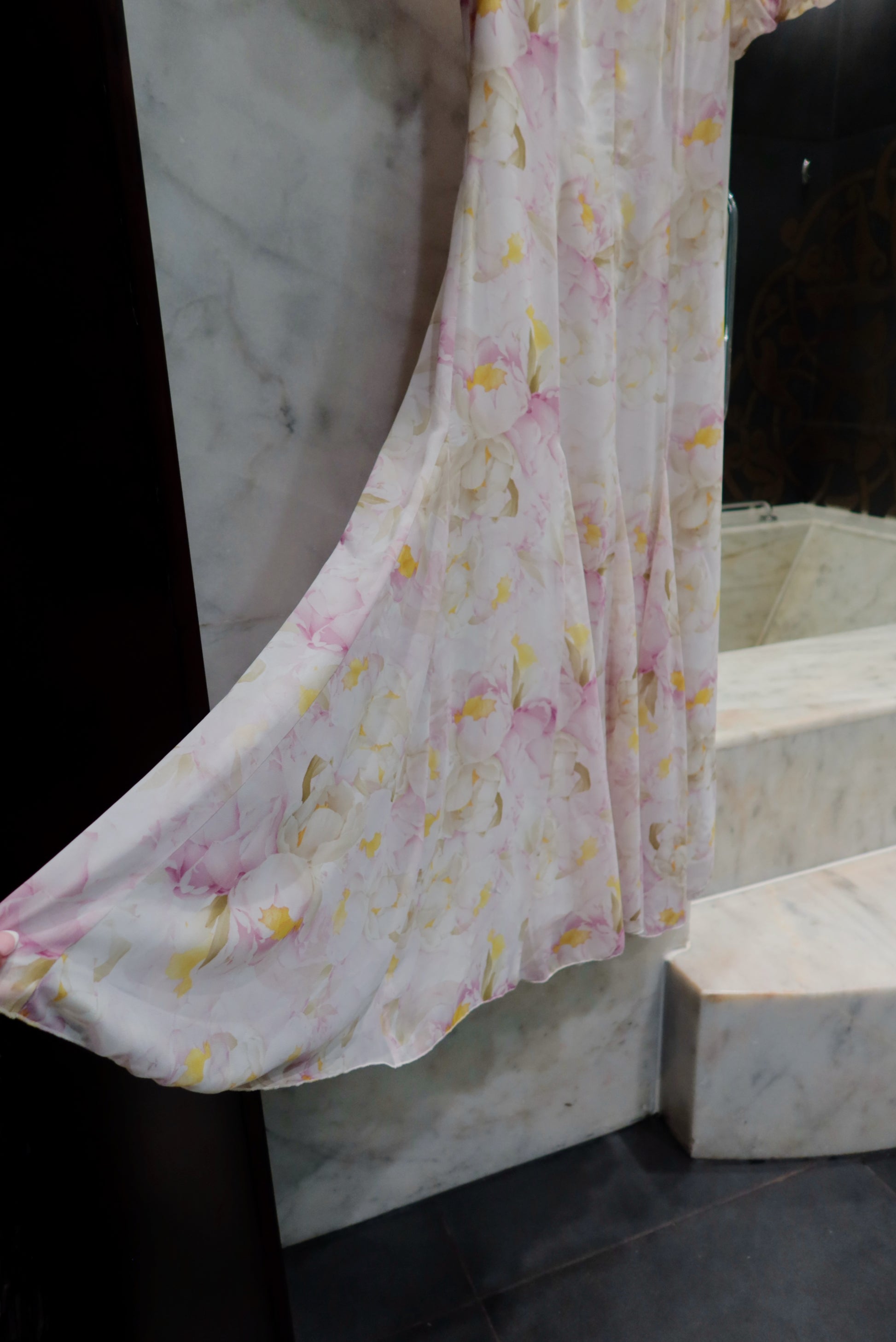 printed with a delicate floral motif in soft, painterly tones. The bodice is gently shaped with clean