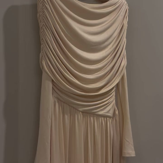 Across the shoulders and arms, gentle ruching creates a cloudlike effect, while the bodice melts into a gathered waistband that defines and flatters without restriction. The full, gathered skirt falls to the ankle in graceful folds, giving the dress an air of delicate drama with every step.